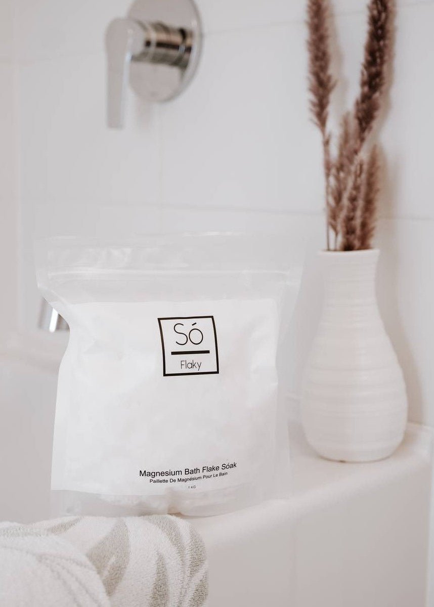 Magnesium flakes dissolve easily into warm bath water, creating a comforting experience that encourages muscles to relax and the nervous system to settle. Use it on its own for a clean, minimalist soak, or blend it with your favourite Só Sóak or Só Salty to create a more layered bathing ritual that suits your mood.