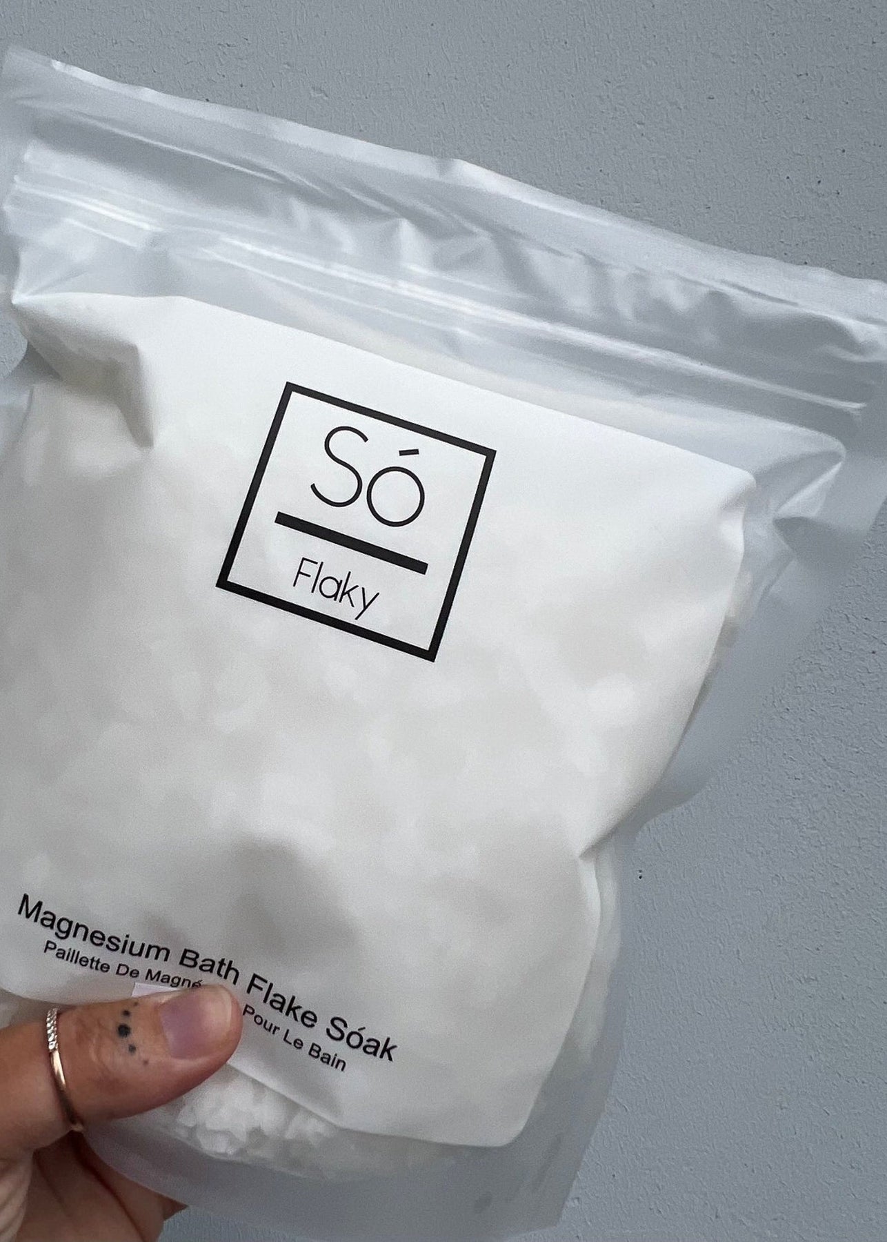 Flaky Só is our unscented Magnesium Bath Flake Sóak, designed for moments when simplicity is exactly what you need. No fragrance, no fuss, just a deeply soothing soak that supports relaxation and restoration. It is the kind of ritual that feels grounding at the end of a long day and gentle enough to reach for often.