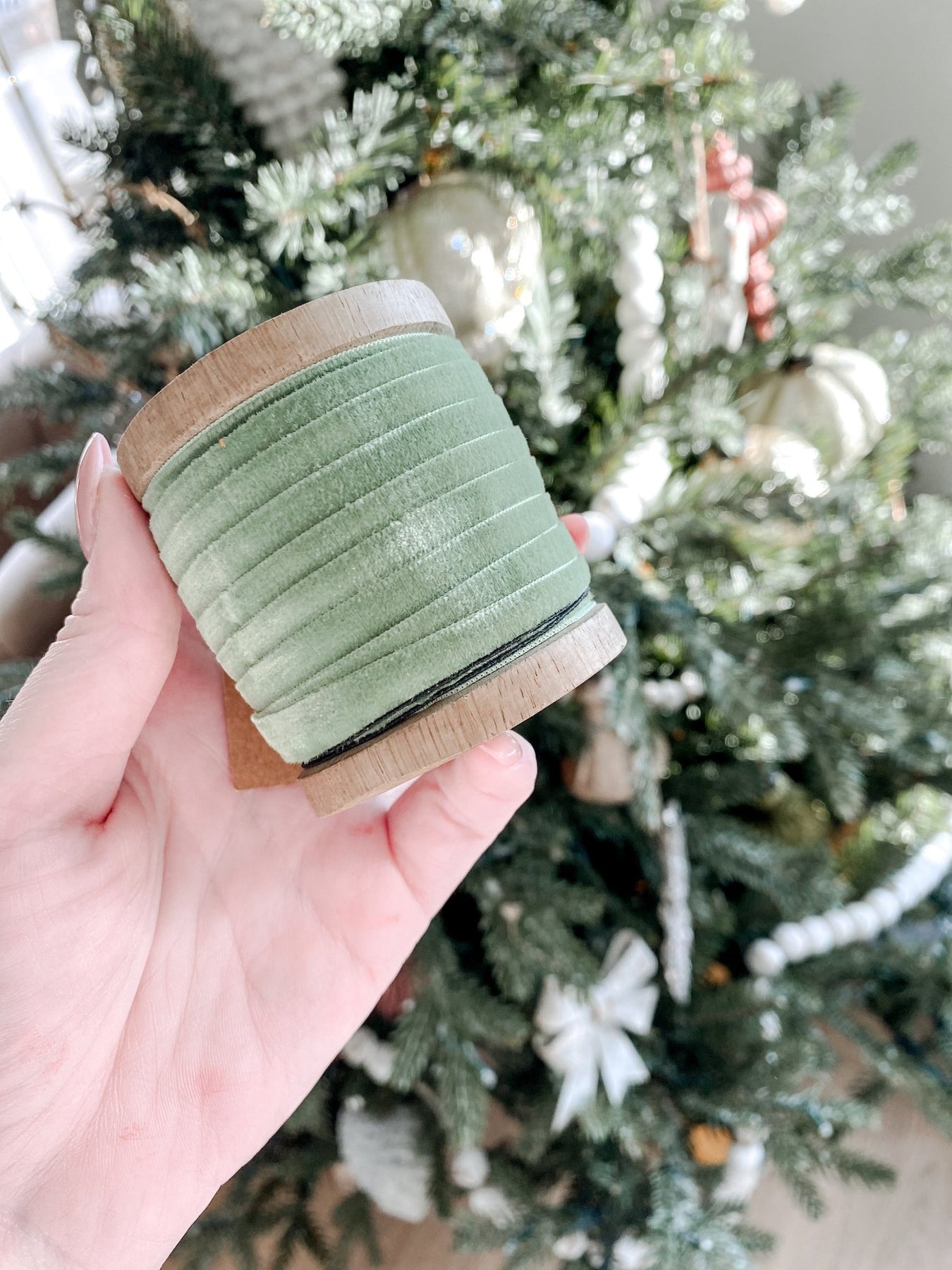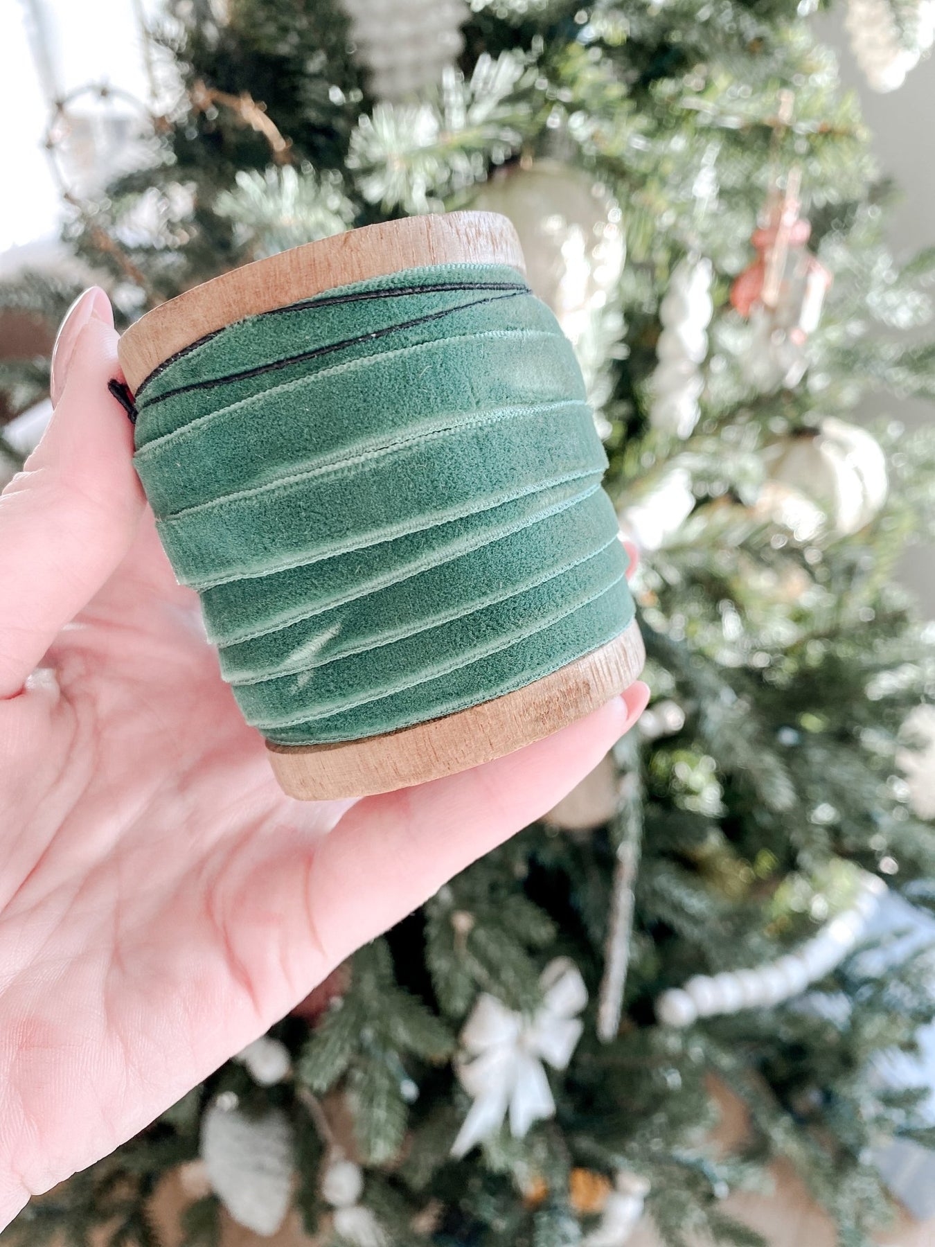 Rich velvet, delicate metallic braid, and gold accents make this ribbon feel instantly special. Wrapped around a vintage mango wood spool, it brings a timeless elegance to gift wrapping, wreaths, and holiday styling.