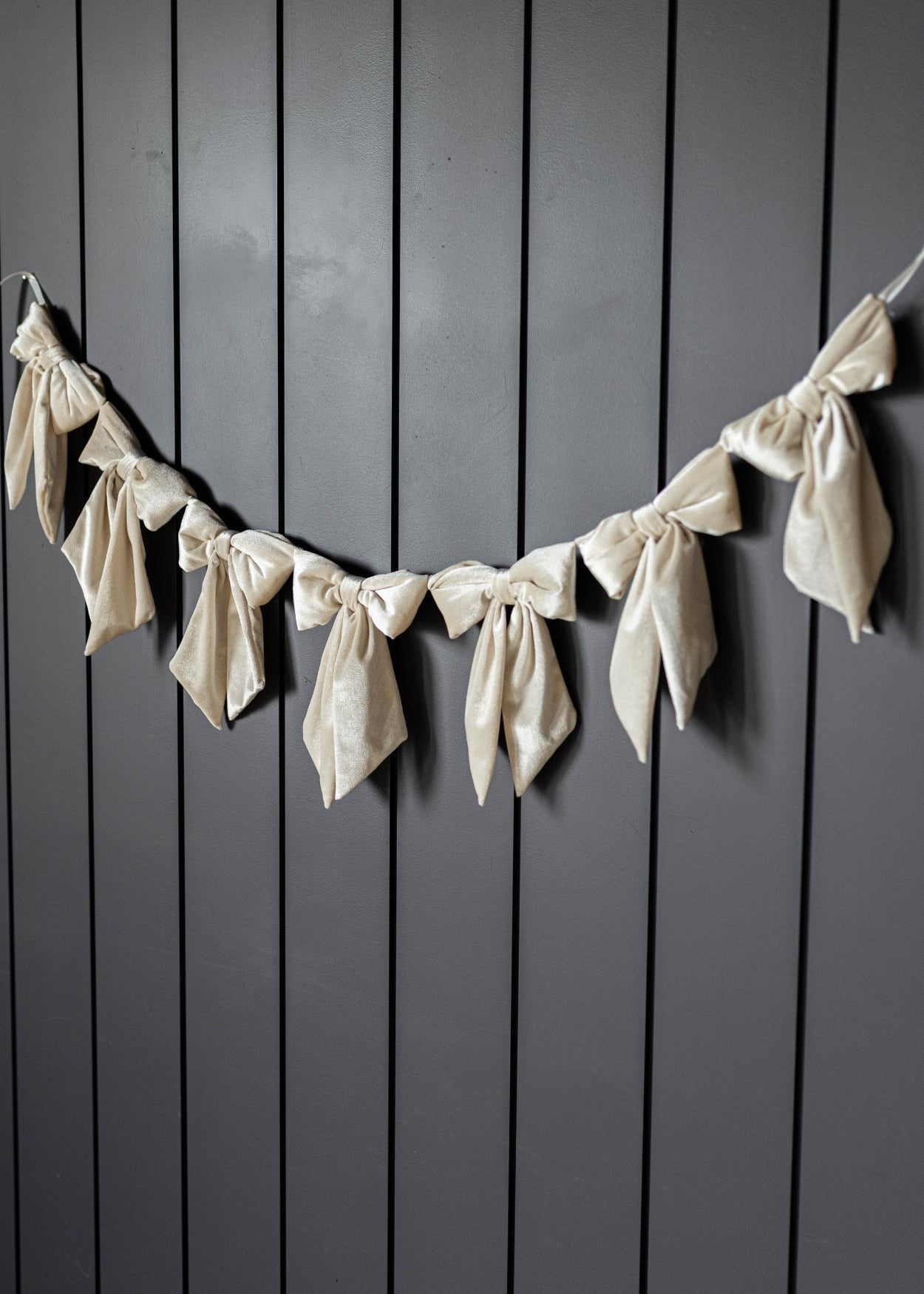 Crafted from soft velvet front to back, our Cream Velvet Bow Garland is the perfect blend of classic charm and whimsical style. Seven plush velvet bows are strung along a coordinating ribbon, with extra length on each end to make tying or hanging effortless.