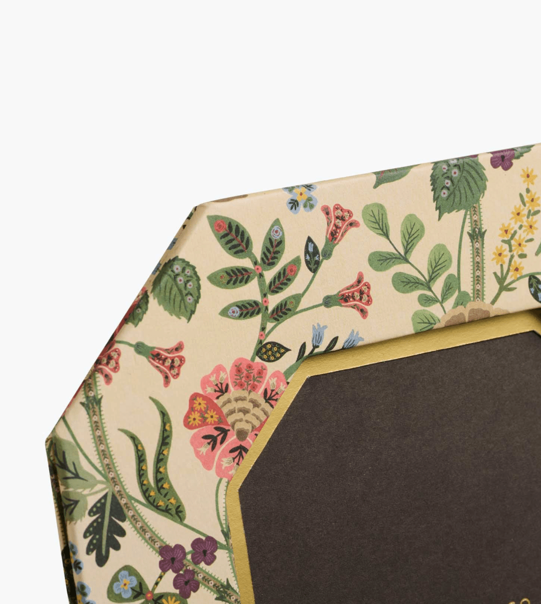 This Gracie Paper Wrapped Picture Frame is made for memories that deserve a beautiful home. Wrapped in textured paper and adorned with illustrated Gracie florals, it brings softness and charm to shelves, nightstands, and desks alike. The octagonal shape adds a subtle sense of character, while the metallic gold photo mat gives your favourite 4x6 photo just the right amount of polish.