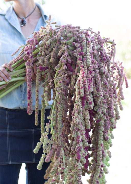Amaranth ‘Mira’ is a true standout, producing long, rope-like tassels in a striking blend of fresh green and soft rose. The bicolored tones catch the light beautifully and add instant movement, texture, and depth to bouquets. Its pendulous form naturally lends itself to dramatic, large-scale arrangements that feel expressive rather than overly styled.