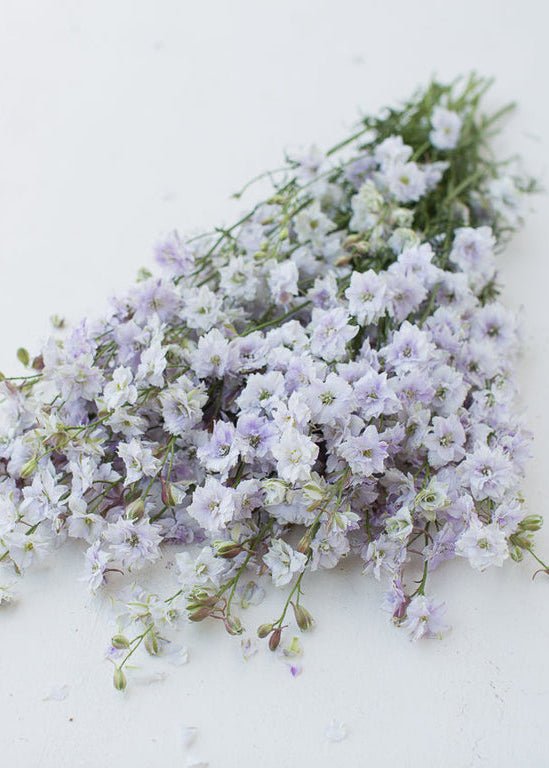 Harvest when about one-third of the blossoms on a stem are open. Larkspur is highly sensitive to ethylene, so keep it away from ripening fruit. Expect a vase life of 5 to 7 days. For drying, allow all but the top 3 to 4 blooms to open, then hang stems upside down in a warm, dark place away from bright light for about 2 weeks.