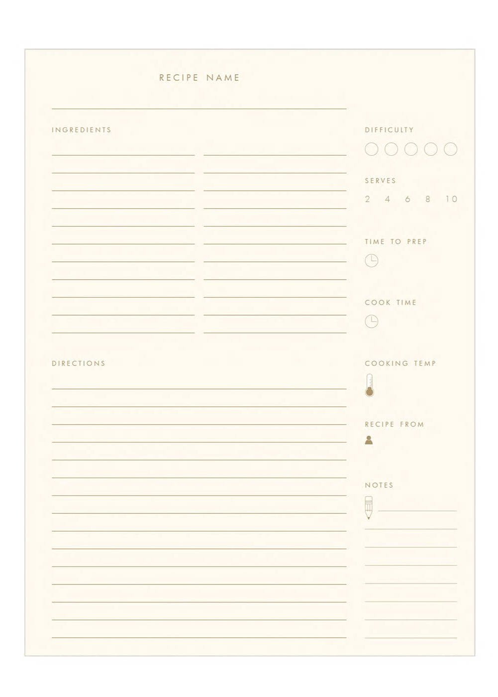 Our Gathered Recipes Keepsake Recipe Book is designed to hold the heart of your kitchen, family favourites, passed-down classics, and your own culinary creations. Thoughtfully divided into five sections: Soup & Salad, Starters & Snacks, Side Dishes, Main Dishes, Desserts & Drinks. It offers space for up to 110 recipes, so every beloved dish has a home.