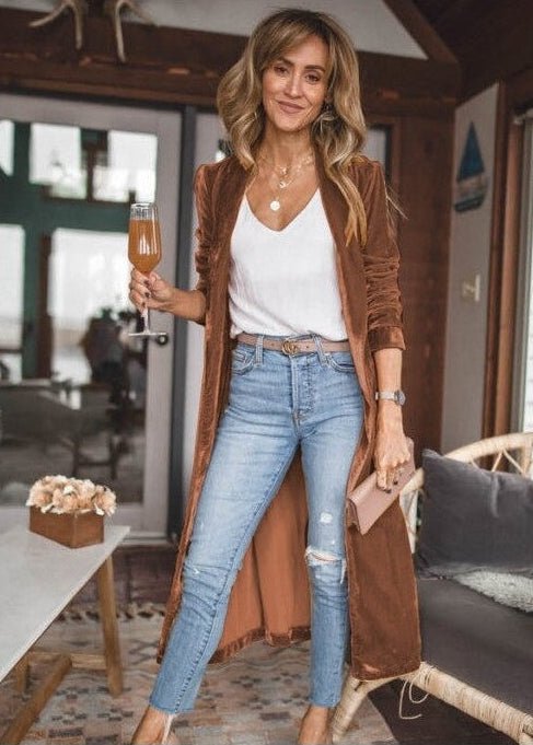 The Velvet Long Cardigan Coat is what happens when everyday comfort meets old-soul elegance. With its draped lapel, soft velvety texture, and flowing silhouette, this piece is made to elevate your simplest winter layers, while still feeling like a blanket you can wear to brunch.