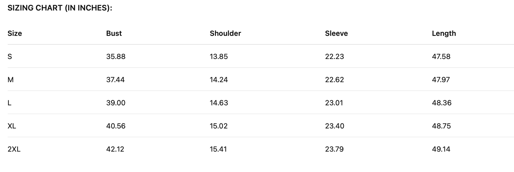 This coat is designed to be loose and long with a soft, relaxed drape. True to size with extra room for layering. If between sizes, size up for a more dramatic look, or size down for a neater silhouette.